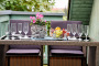 - Ein Balkon mit Gartenmöbeln.