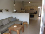 - 1 Wohnraum im 1.OG mit offener Küche, Essbereich und Eckcouch, TV-Flachbildschirm und kleiner Bibliothek, Eckbalkon (16 m²) mit Strandkorb und Gartenmöbeln