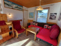 Wohnzimmer mit Flachbild-TV, Radio und Kinderhochstuhl