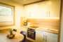 gut ausgestattete Pantryküche mit Herd, Wasserkocher, Toaster, Gläser, Geschirr, Besteck, Kaffeemaschine, Kühlschrank, Fernseher, Radio, Kinderreisebett & Hochstuhl
