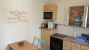 gut eingerichtete Küche mit Ceranherd, Wasserkocher, Backofen, Geschirr, Besteck, Gläser, Kaffeemaschine, Toaster, Kühlschrank