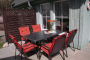1 Sonnenterrasse mit Gartenmöbeln, großem Sonnenschirm und zwei Sonnenliegen