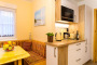 1 Wohnraum mit Elektrokamin und Küche mit Essbereich